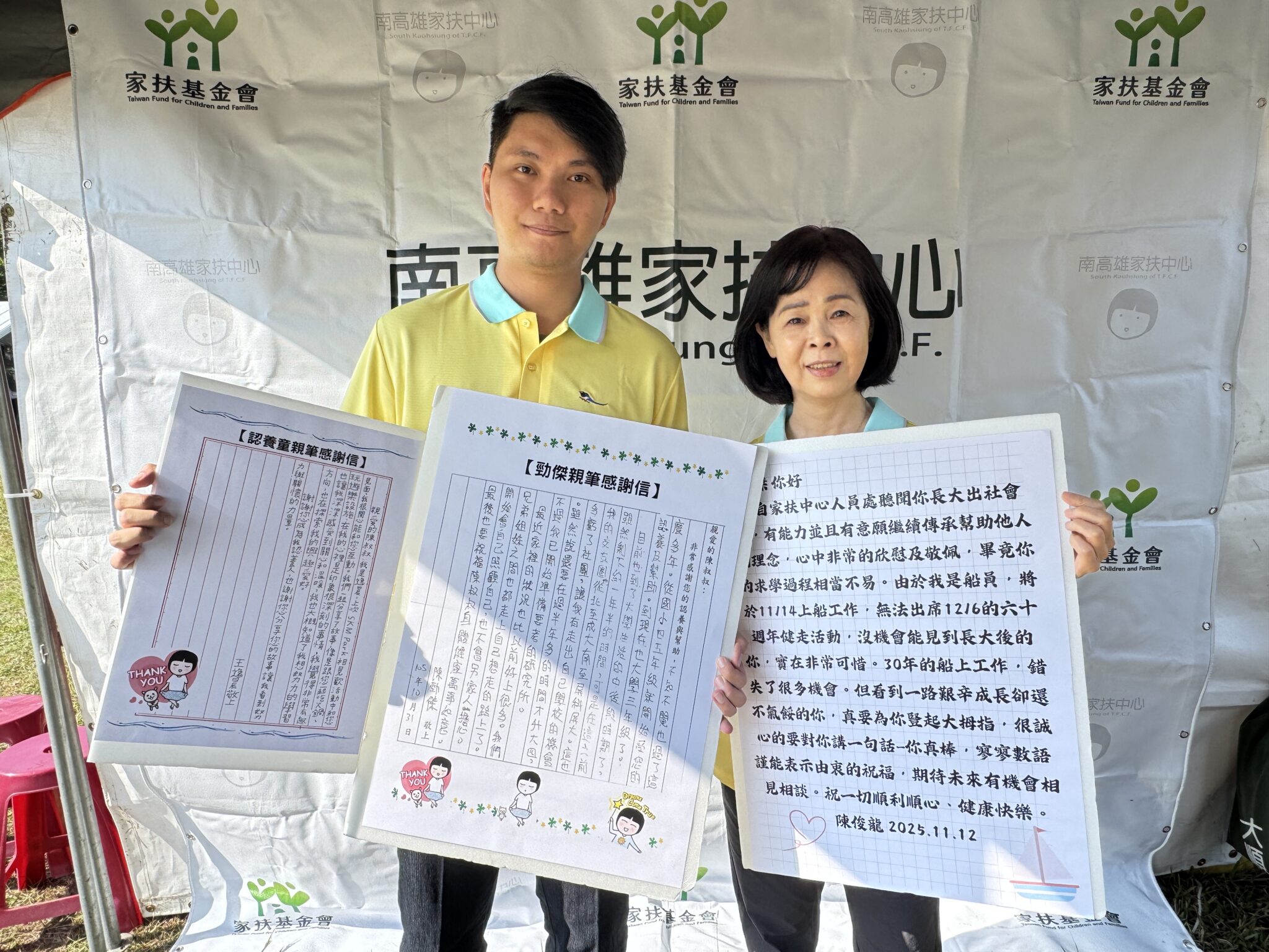 大會主席莊月珠主委致詞時特別帶著-加盟美國道奇棒球隊的家扶青年柯敬賢出場,另也邀請家扶自立青年,現已事業穩定的陳勁傑分享感恩故事,訴說自己成為家扶認養人的初心動念。陳勁傑在分享中哽咽提到,成長過程中家庭變故,一度對人生感到迷惘,幸虧有一對認養人夫婦長達十年的默默資助與鼓勵,讓他得以穩定就學、完成學業。「我一直希望有一天能親口對幫助我的『無名英雄』說聲謝謝。是他們的愛,讓我今天能站在這裡,並有能力幫助其他孩子。」活動現場來了一位「神秘嘉賓」,正是陳勁傑幼時的認養人—潘怡憓女士,帶著先生陳俊龍寫的一封信驚喜現身。潘女士讀著先生寫給勁傑的信「由於我是船員,長期在海上工作,雖然今天沒機會看到長大的你,但看到艱辛成長不氣餒的你,要為你豎起大拇指,你真的很棒」;相隔十年,兩人淚眼相擁。陳勁傑緊握著潘女士的手激動表示:「我記得幼時承諾過未來有能力也要像陳叔叔嬸嬸擔任認養人,幫助其他孩童。現在我做到了!今天,我就是您愛的傳承」。潘怡憓女士也紅著眼眶說:「看到勁傑能獨立自主,並且回過頭來當認養人,我覺得過去的付出是值得的」。